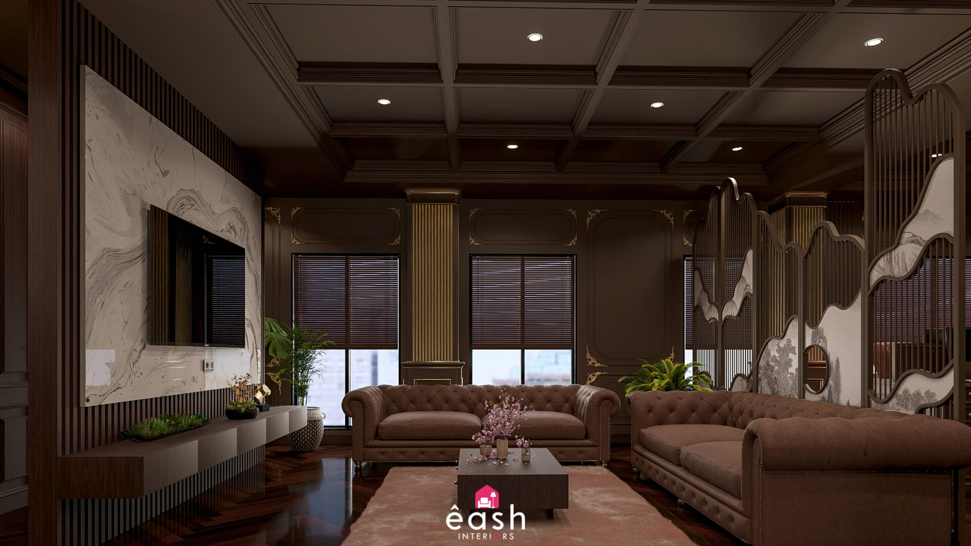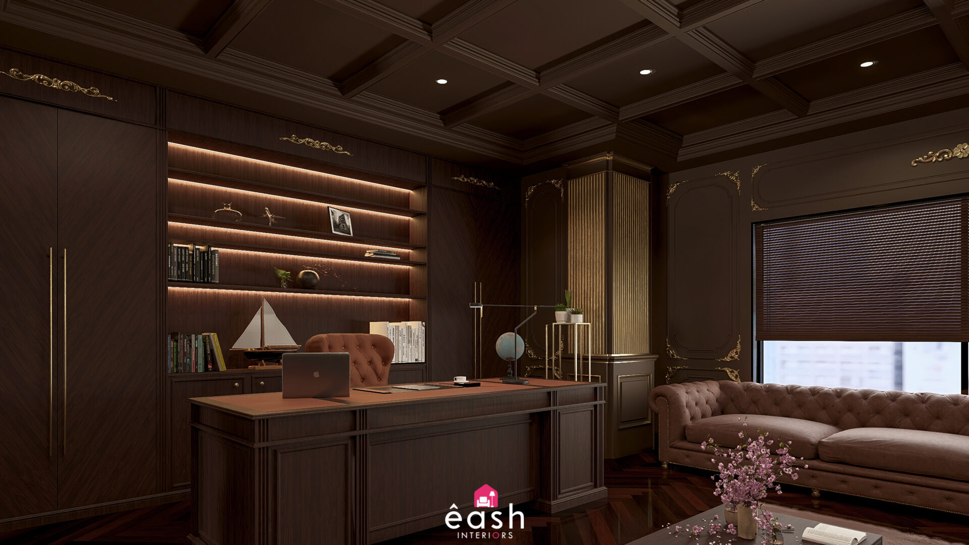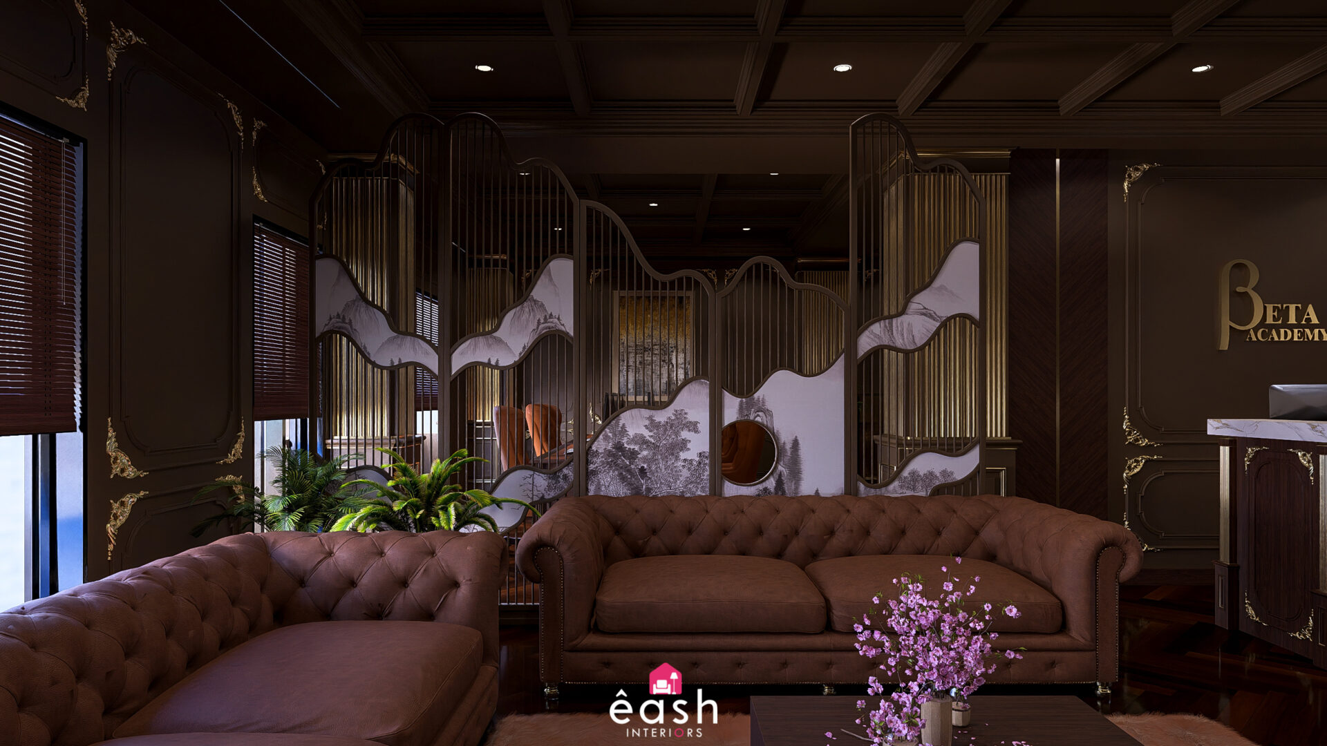For the executive workspace of Beta Academy, eash Interiors crafted a theme-based classic office design rooted in elegance and authority. A dark brown monochromatic color scheme builds a warm, grounded atmosphere suited for decision-making and professionalism. The design maintains balance, rhythm, and unity, ensuring sophistication across all functional zones.