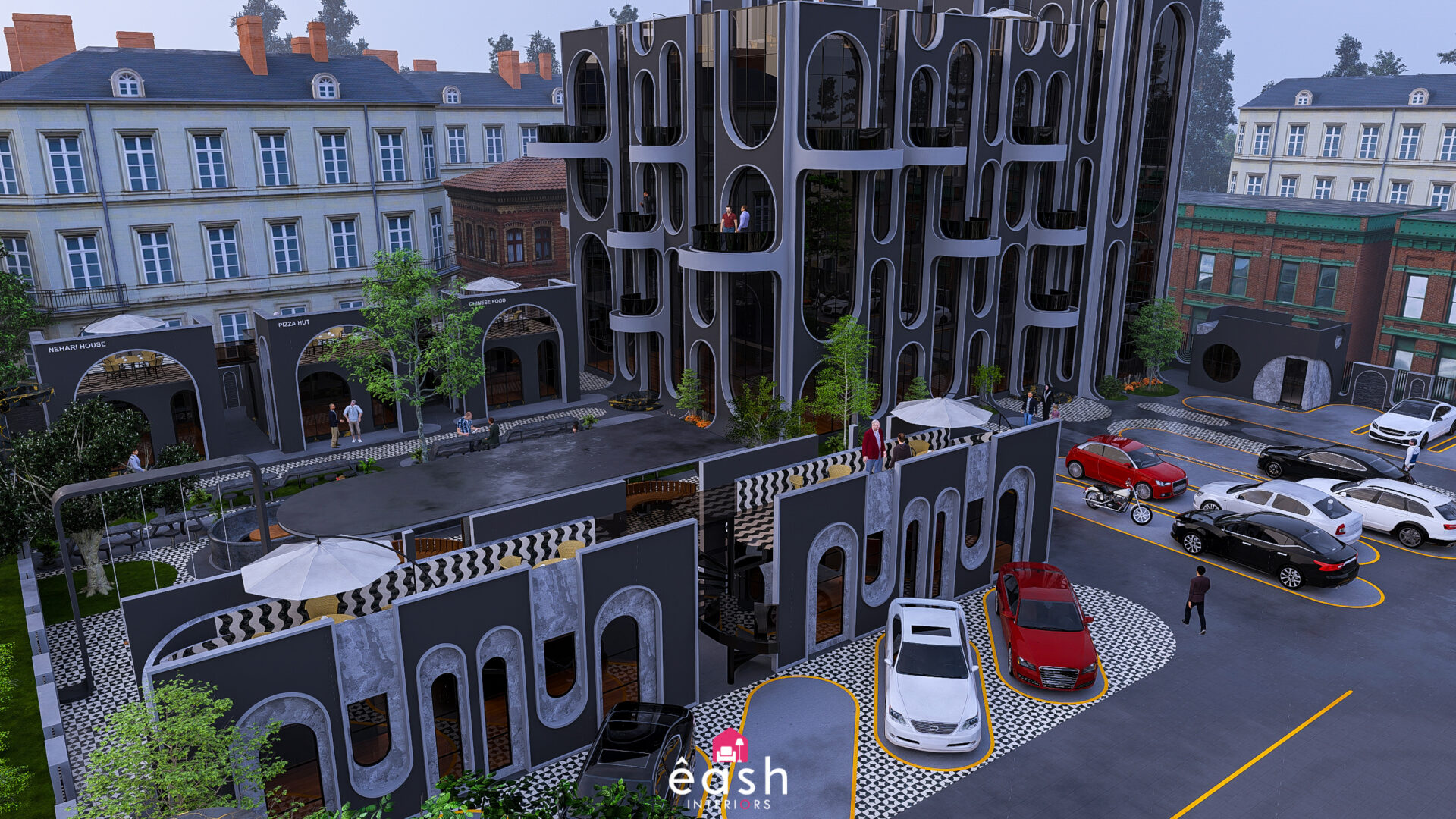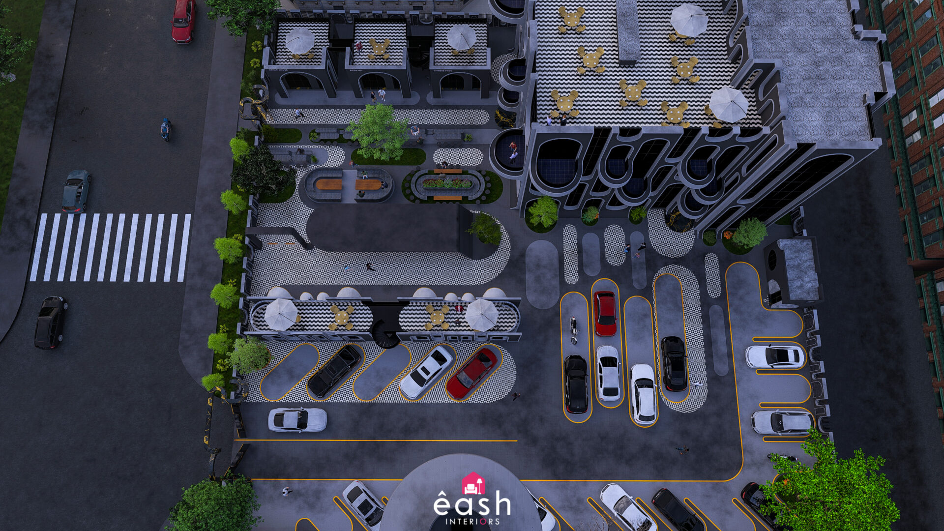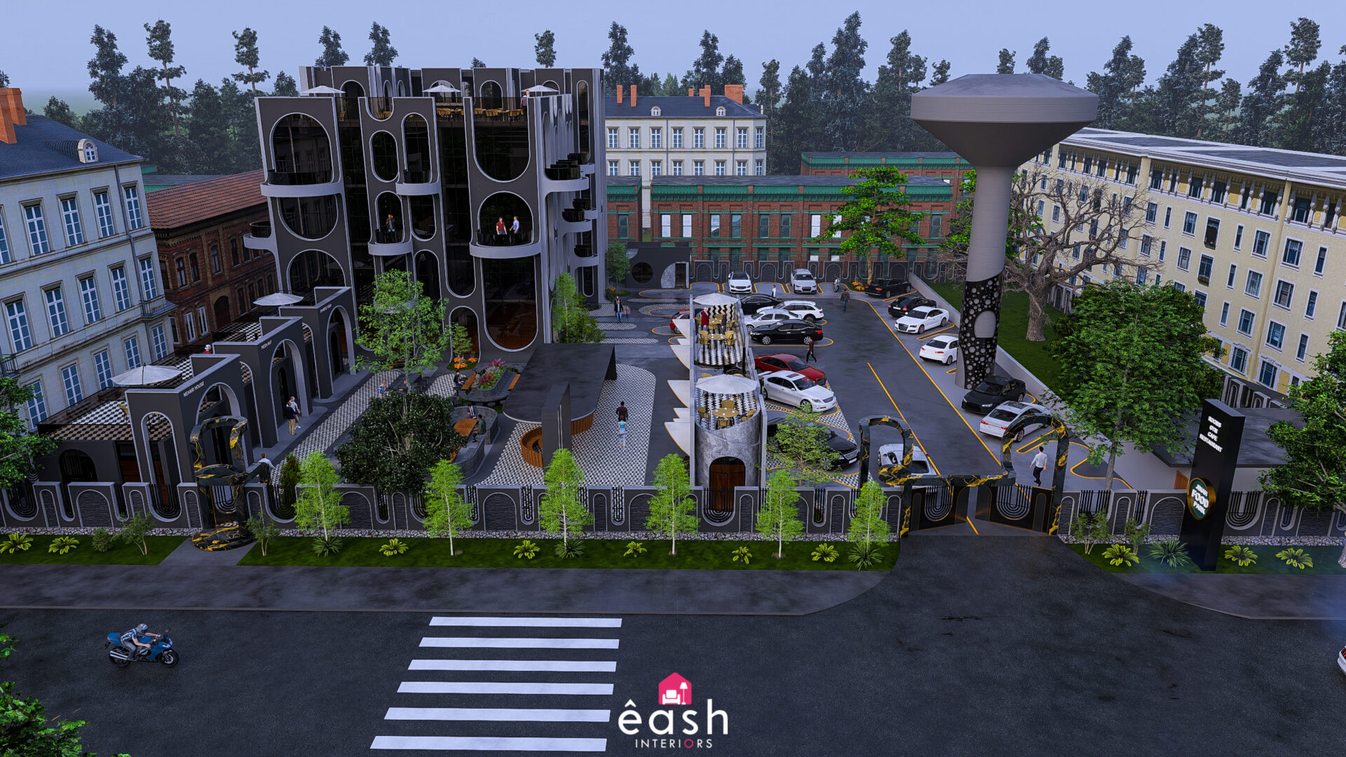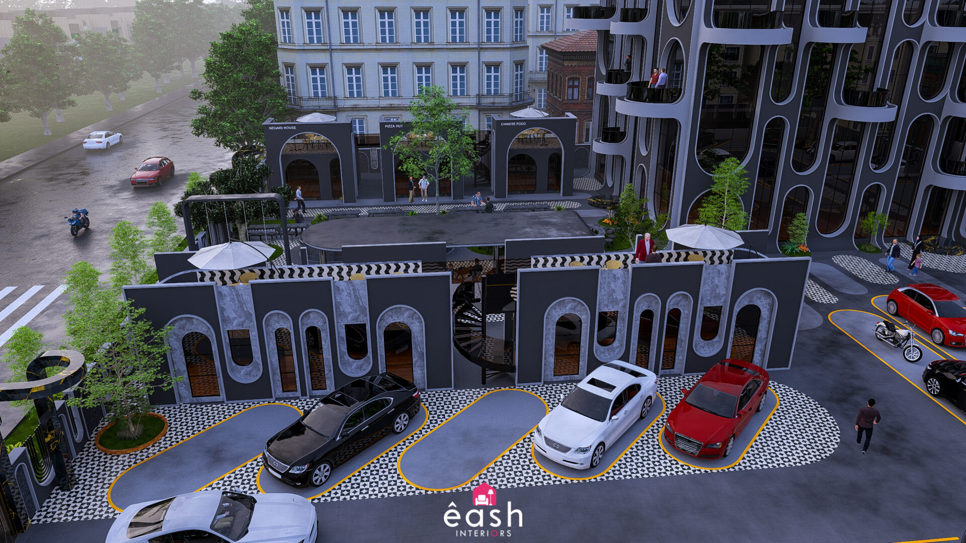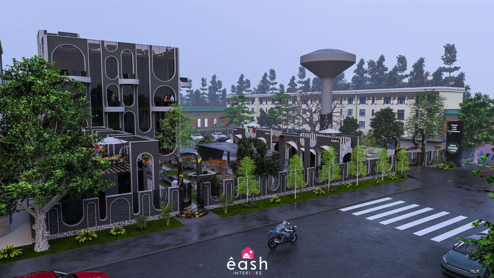 Spanning across 30,000 sqft, eash Interiors developed a dynamic hospitality destination featuring a 4-story, 3,500 sqft building designed for restaurant and hotel use. This thoughtfully composed structure includes a rooftop pool and gymnasium, with supporting amenities like open-air seating, food kiosks, and a designated parking area. The entire layout follows a theme-based approach that merges comfort, function, and lifestyle.