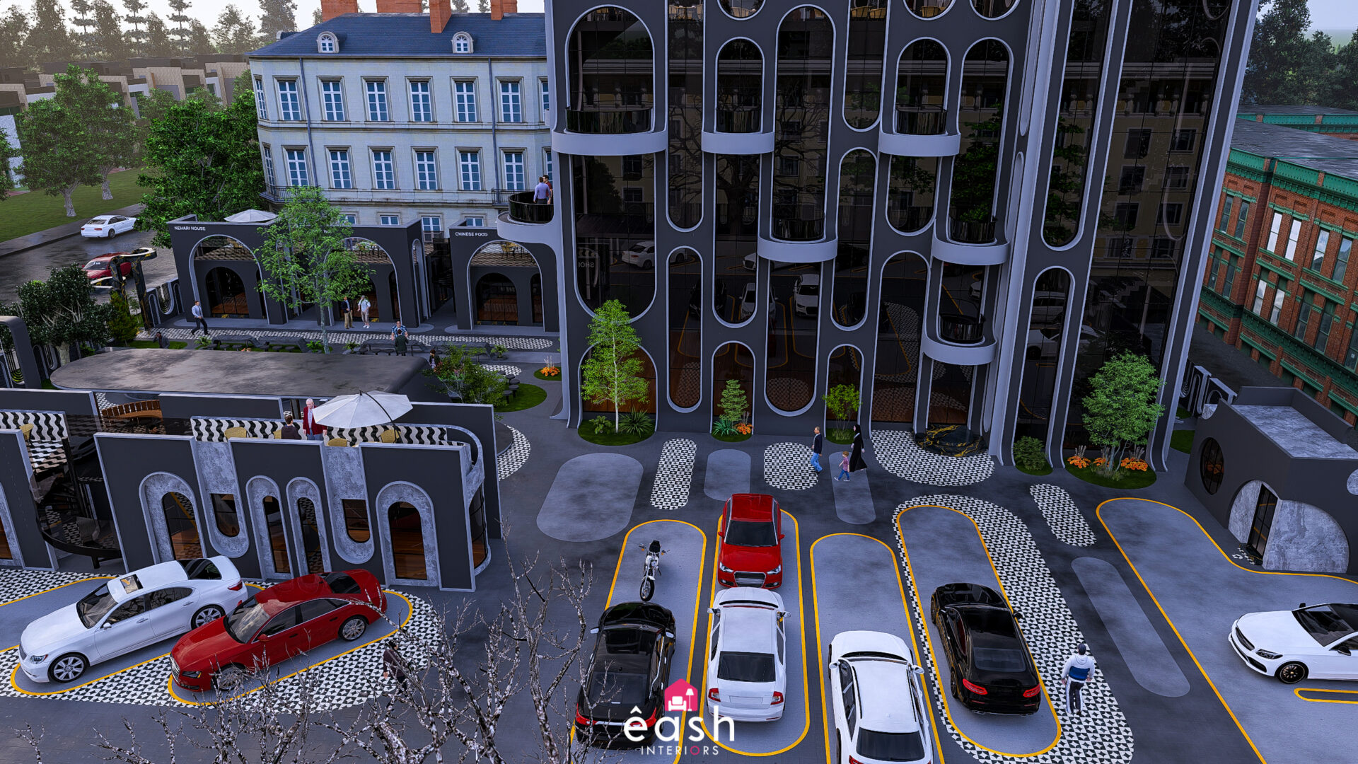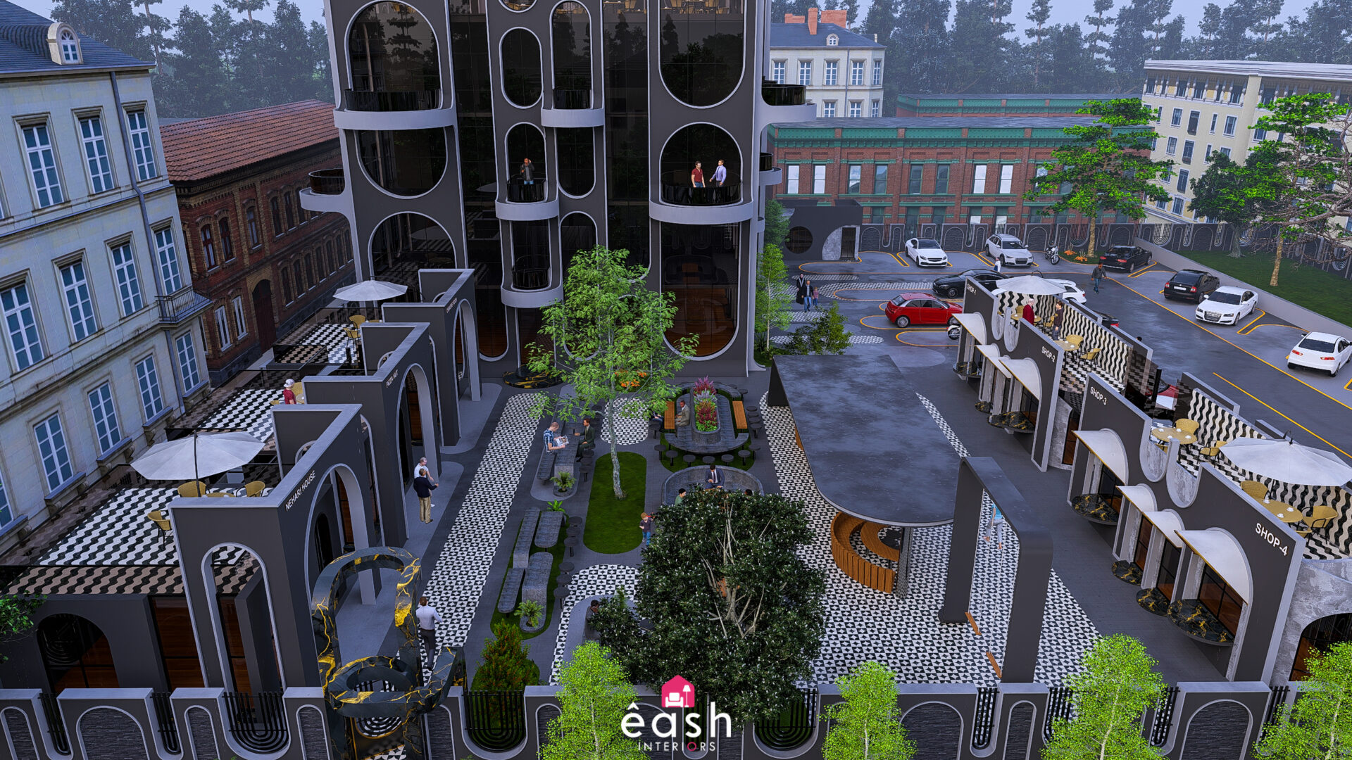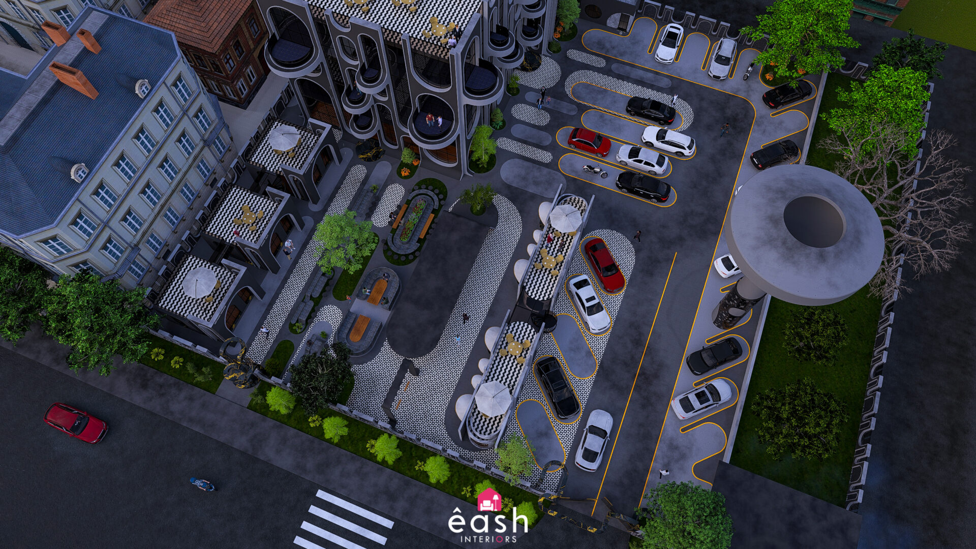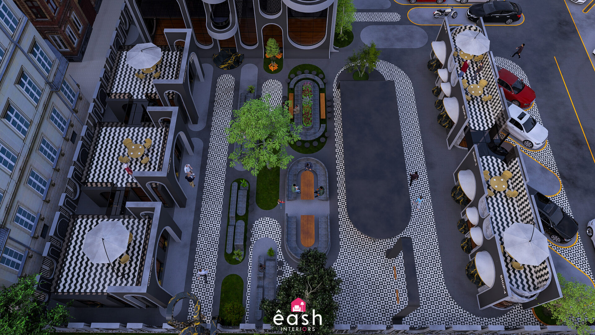 Spanning across 30,000 sqft, eash Interiors developed a dynamic hospitality destination featuring a 4-story, 3,500 sqft building designed for restaurant and hotel use. This thoughtfully composed structure includes a rooftop pool and gymnasium, with supporting amenities like open-air seating, food kiosks, and a designated parking area. The entire layout follows a theme-based approach that merges comfort, function, and lifestyle.