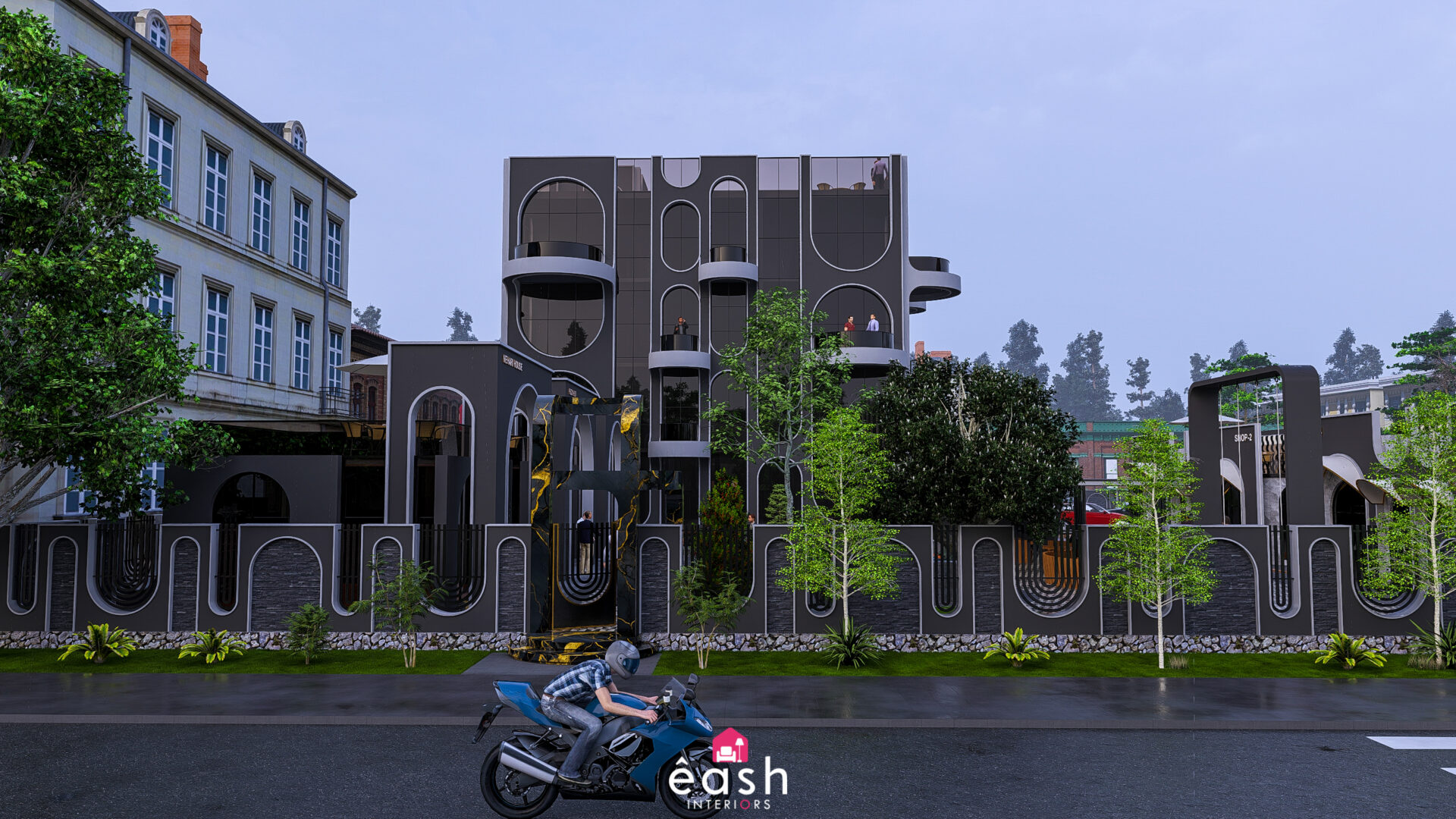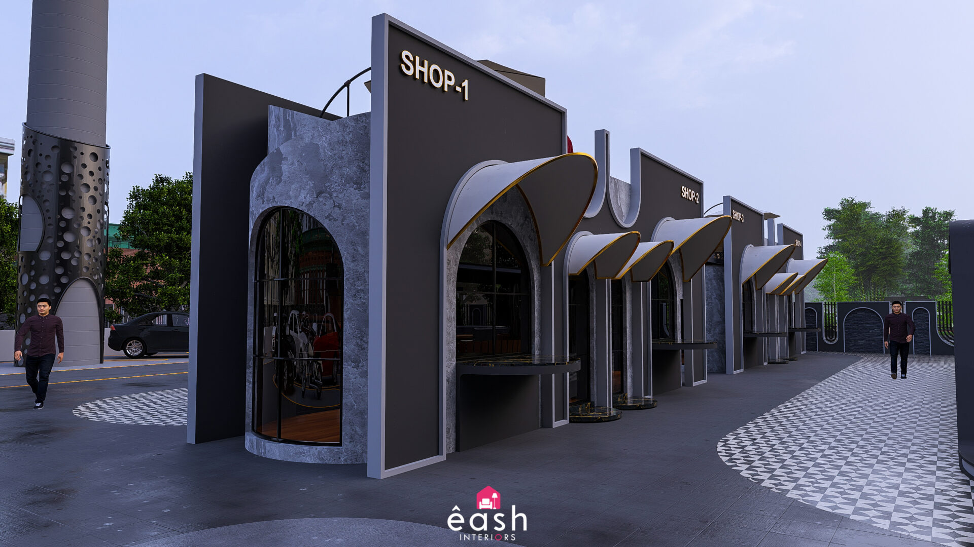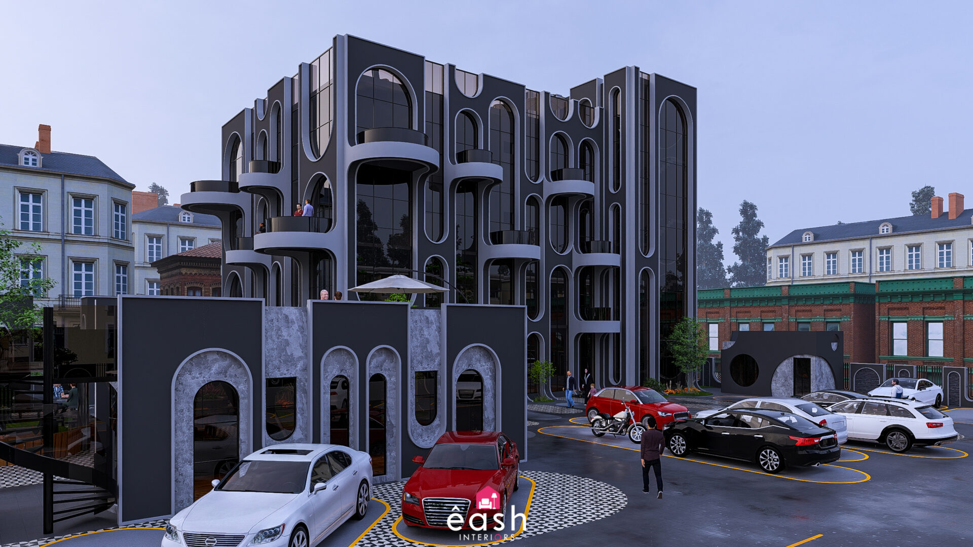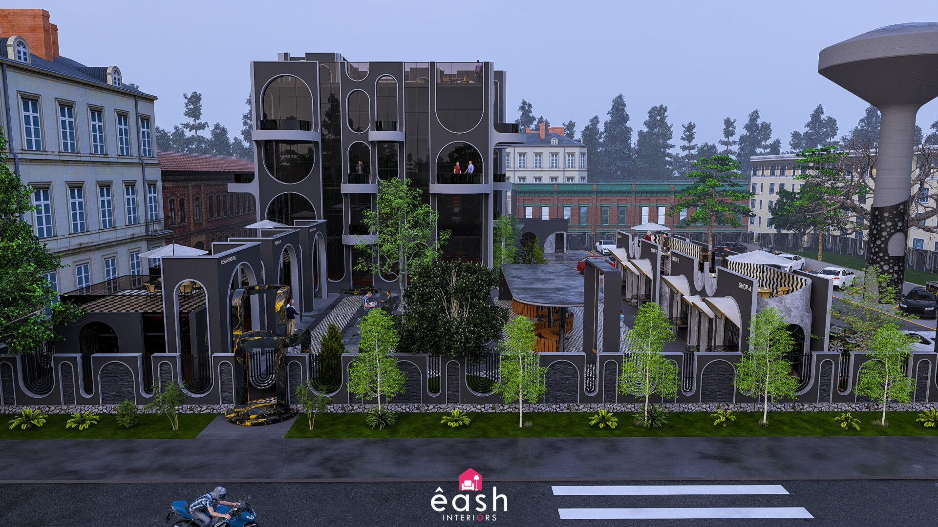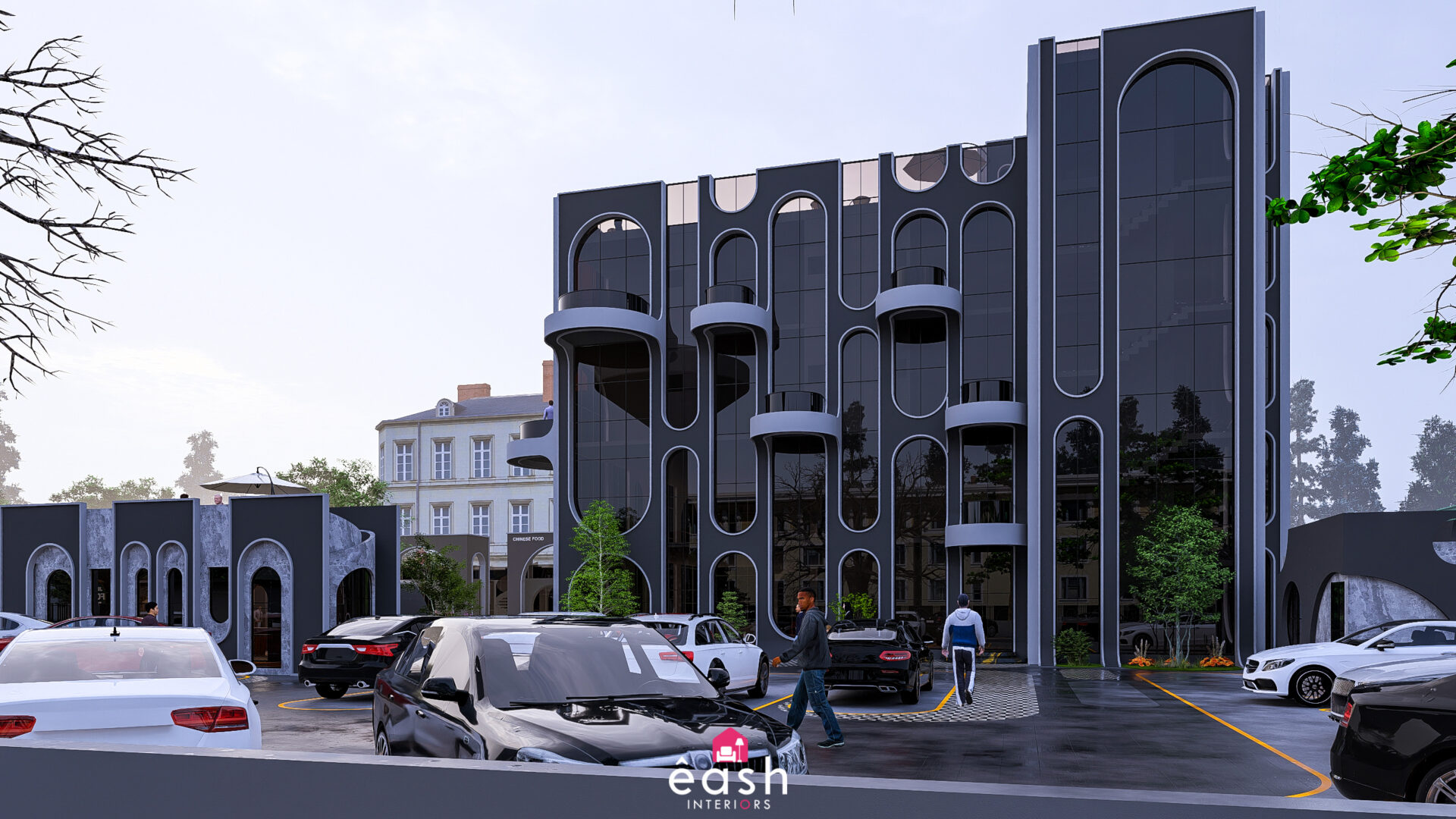 Spanning across 30,000 sqft, eash Interiors developed a dynamic hospitality destination featuring a 4-story, 3,500 sqft building designed for restaurant and hotel use. This thoughtfully composed structure includes a rooftop pool and gymnasium, with supporting amenities like open-air seating, food kiosks, and a designated parking area. The entire layout follows a theme-based approach that merges comfort, function, and lifestyle.