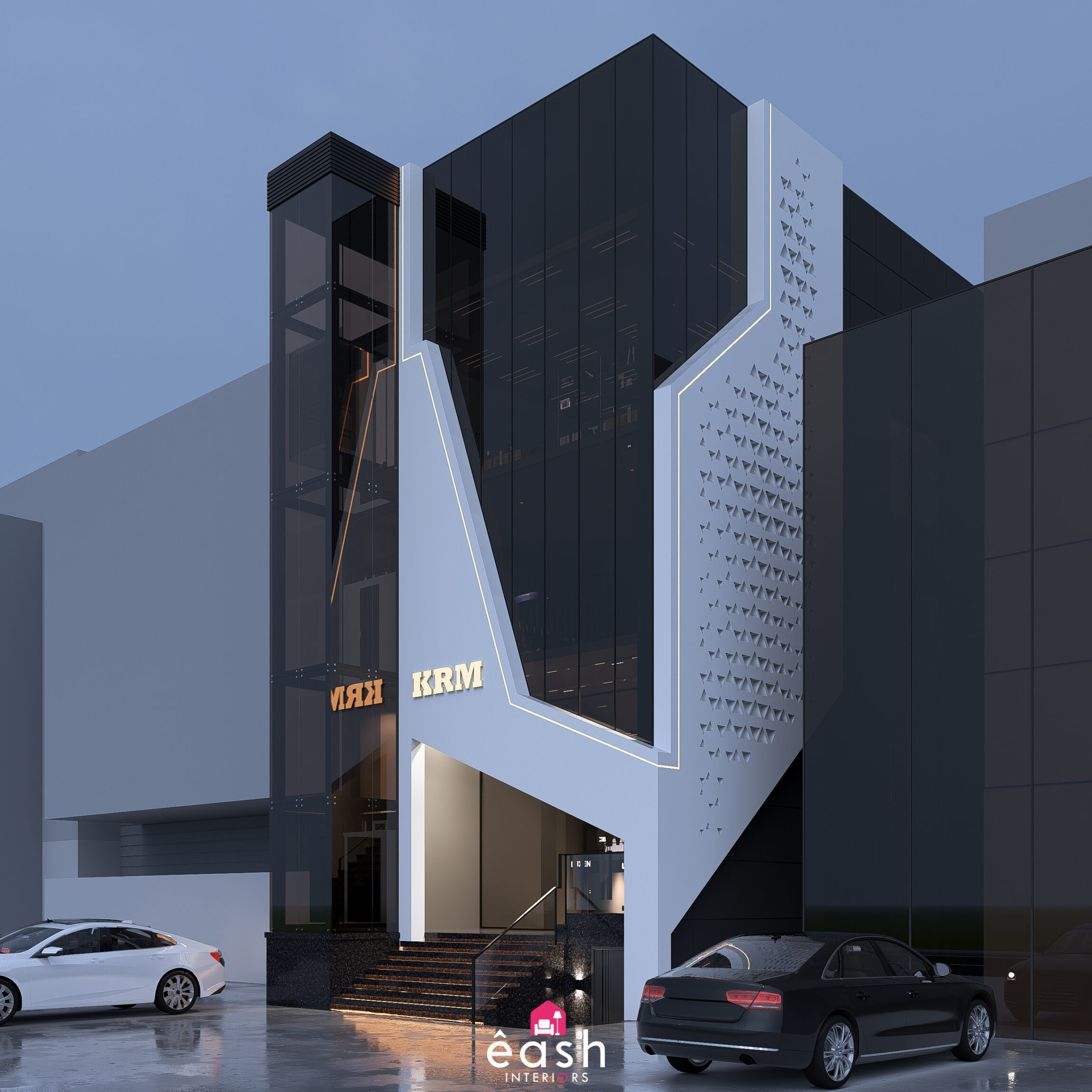 eash Interiors worked on the Exterior Design of KRM Plaza, focusing on an ultra-modern design. Located in Gujrat Plaza, this project represents the future of contemporary architecture, combining innovative materials, cutting-edge design, and sleek lines. The design features a dynamic, geometric façade that stands out in the skyline, integrating modern textures, glass elements, and striking lighting to create a bold visual impact and a highly functional commercial space.